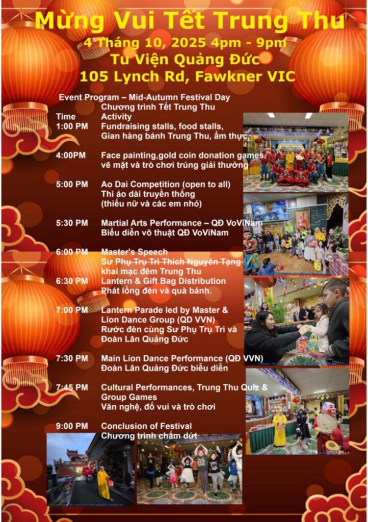 từ 4 giờ đến 9 giờ tối Thứ Bảy ngày 04/10/2025 tại Tu Viện Quảng Đức, 105 Lynch Road, Fawkner, VIC 3060.