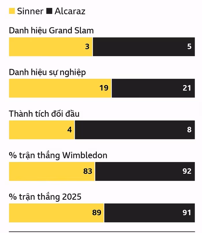 Tuy nhiên, Jannik Sinner cũng không kém cạnh. Dù từng bị treo vợt 3 tháng đầu năm vì vi phạm doping, tay vợt người Ý vẫn giữ vững vị trí số 1 thế giới với thành tích ấn tượng: 98 thắng – 11 thua trong hai mùa gần nhất. Anh vào đến chung kết Grand Slam lần thứ tư liên tiếp và lần đầu tiên tại Wimbledon.