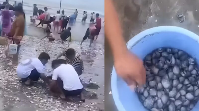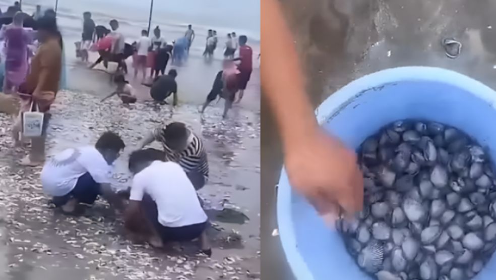 Trên mạng xã hội Trung Quốc, hàng loạt video lan truyền ghi lại cảnh người dân chen nhau mang xô, chậu, thùng nhựa ra biển để nhặt hải sản. Hiện tượng này được dân địa phương gọi là “cơn mưa hải sản”.