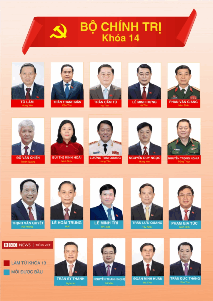 Trong số này chỉ còn lại ba người trong “ngũ trụ” khóa 13 gồm ông Tô Lâm, Trần Thanh Mẫn (chủ tịch Quốc Hội) và Trần Cẩm Tú (thường trực Ban Bí Thư).