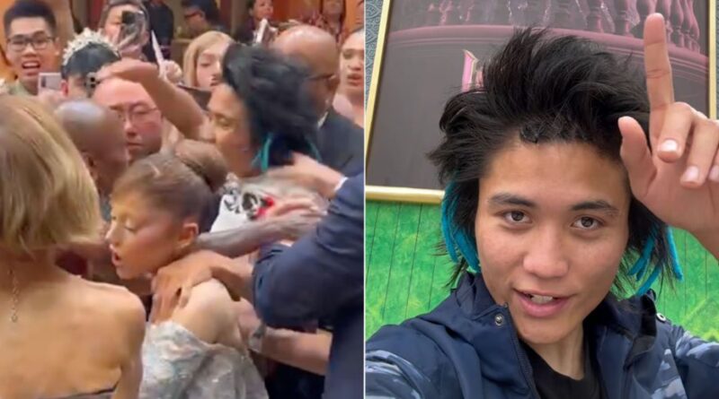 Trước đó, vào ngày 13/11, Johnson Wen, nổi tiếng trên Instagram với biệt danh Pyjama Man – gây náo loạn thảm đỏ lễ ra mắt phim Wicked: For Good khi nhảy qua hàng rào, lao tới Ariana Grande. Ngôi sao người Mỹ hoảng hốt, cố gắng thoát ra trong khi Wen vừa choàng tay qua vai cô vừa liên tục nhảy lên xuống để gây sự chú ý.