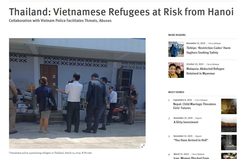 Tổ chức nhân quyền quốc tế Human Rights Watch (HRW) vừa công bố tài liệu về sự hợp tác ngày càng chặt chẽ của chính phủ Thái Lan với nhà nước Việt Nam để đàn áp xuyên quốc gia hàng loạt những người đang được Cao Ủy Tị Nạn LHQ bảo vệ. Xem: https://www.hrw.org/news/2025/11/13/thailand-vietnamese-refugees-at-risk-from-hanoi
