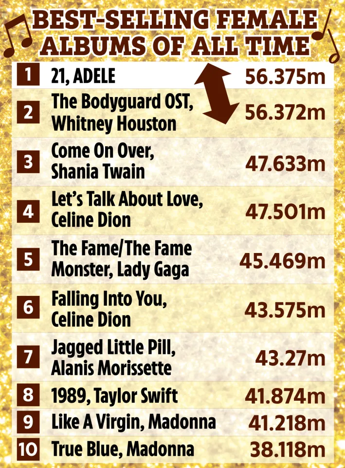 Trước khi bị 21 vượt qua, The Bodyguard – soundtrack của bộ phim cùng tên do Whitney Houston thủ vai chính là album nữ bán chạy nhất lịch sử suốt hơn 30 năm. Thành công của album gắn liền với siêu hit I Will Always Love You, cùng các ca khúc kinh điển như I Have Nothing, Run To You và I’m Every Woman.