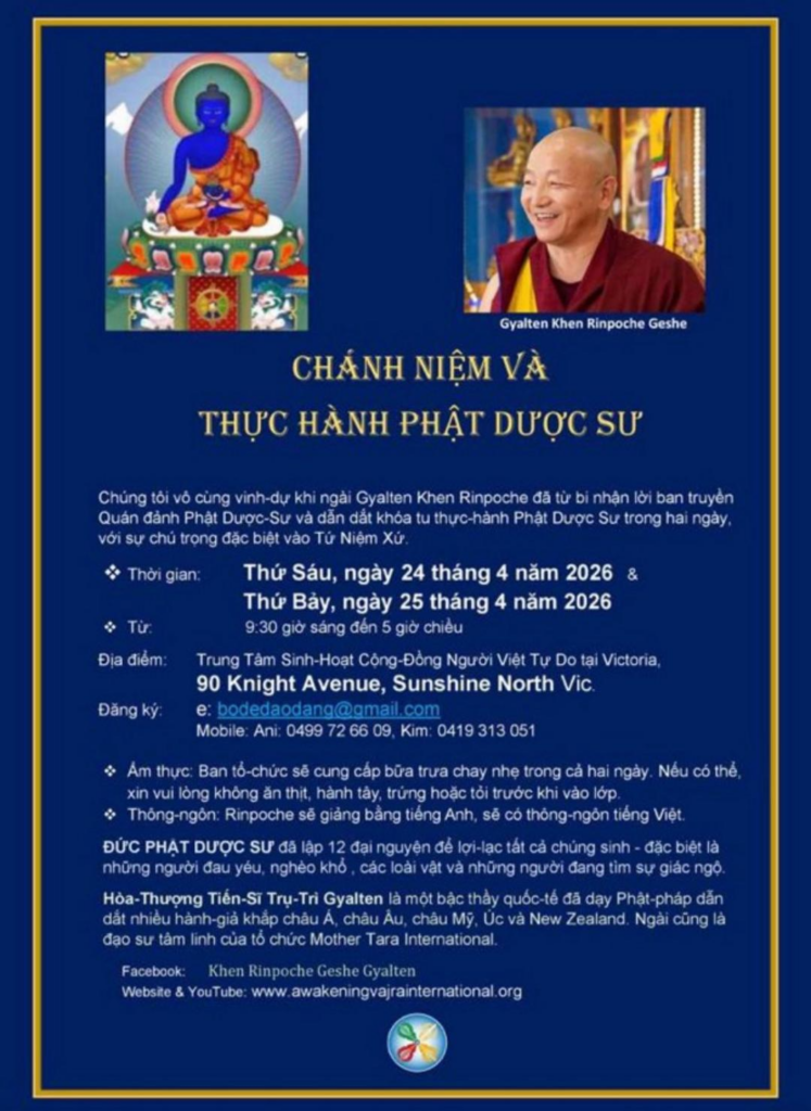 Chúng tôi vô cùng vinh-dự khi ngài Gyalten Khen Rinpoche đã từ bi nhận lời ban truyền Quán đảnh Phật Dược-Sư và dẫn dắt khóa tu thực-hành Phật Dược Sư trong hai ngày, với sự chú trọng đặc biệt vào Tứ Niệm Xứ.