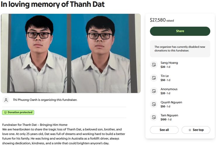 “Anh ấy đã sống và làm việc tại Úc với tư cách là một tài xế xe nâng, luôn thể hiện sự tận tụy, lòng tốt và nụ cười có thể làm bừng sáng cả ngày của bất kỳ ai”, gia đình chia sẻ trong bài đăng trên GoFundMe khi họ tìm cách đưa tro cốt của anh về Việt Nam để nói lời tạm biệt cuối cùng và an nghỉ anh trong tình yêu thương và sự tôn nghiêm.