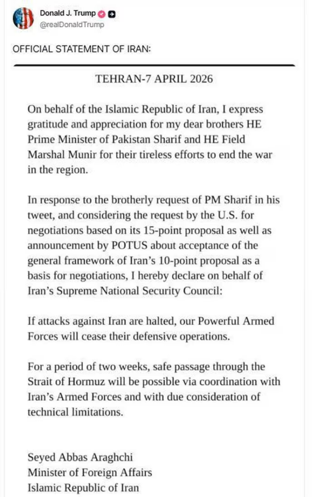 Ngày 7/4, Tổng thống Mỹ Donald Trump tuyên bố ông đã đồng ý “tạm dừng việc ném bom và tấn công Iran trong khoảng thời gian 2 tuần.”