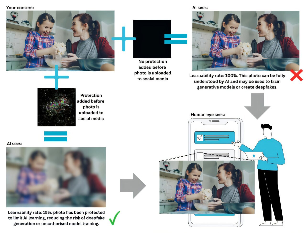 Chẳng hạn, người dùng có thể tự động áp dụng một lớp bảo vệ đối với hình ảnh trước khi đăng tải, ngăn AI học các đặc điểm khuôn mặt để tạo ra các sản phẩm deepfake.