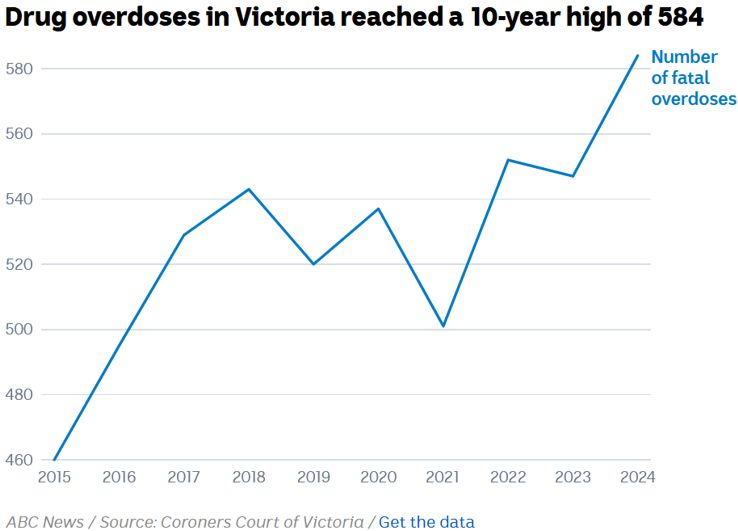 Năm 2024, Victoria ghi nhận 584 ca tử vong do quá liều ma túy, cao nhất trong thập kỷ, tăng từ 547 ca (2023) và 552 ca (2022). Tòa án Điều tra Tử thi cho biết ma túy bất hợp pháp chiếm 65.6% ca, so với dưới 50% cách đây 10 năm.