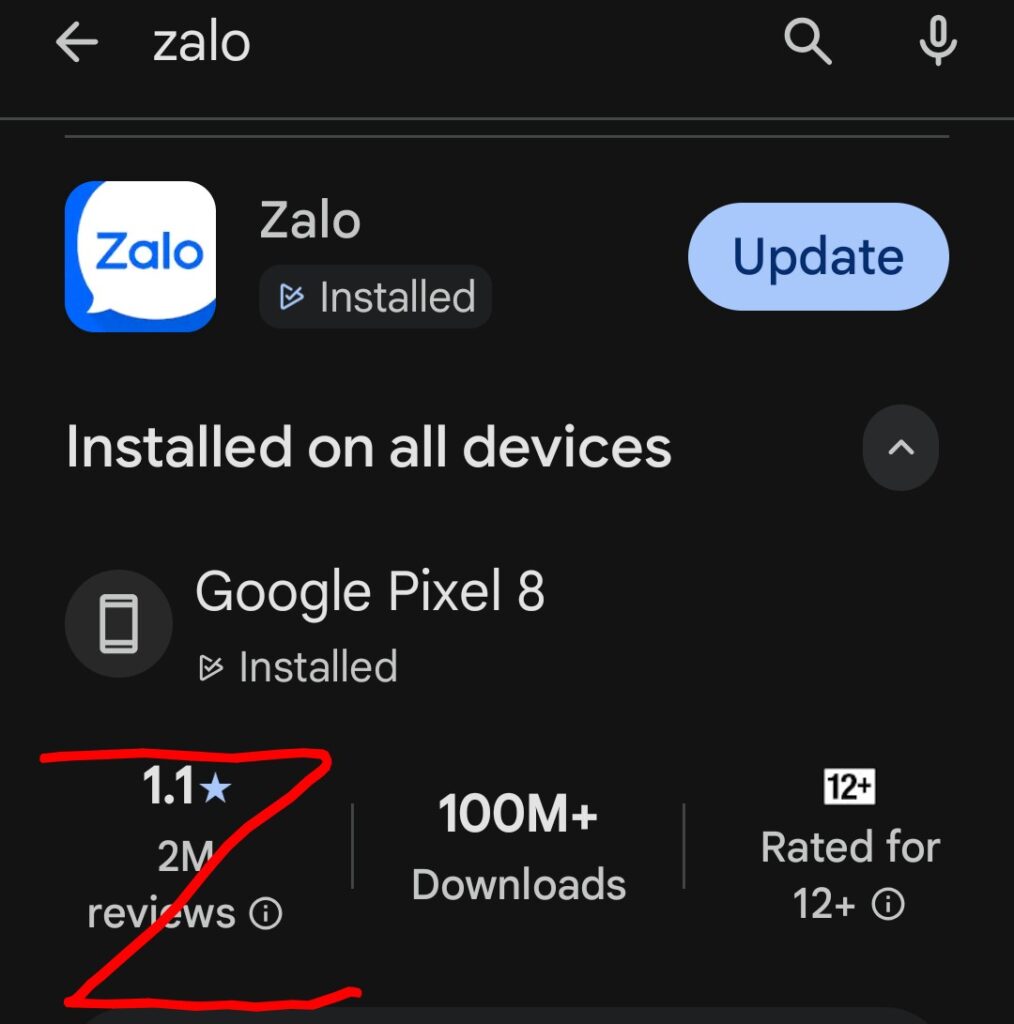 Cho Zalo ở Android, hơn 2 triệu người dùng đã đánh giá, từ 1 (là tệ nhất có thể, chứ không có zero), đến 5. Tính trung bình, thì Zalo được 1,1.